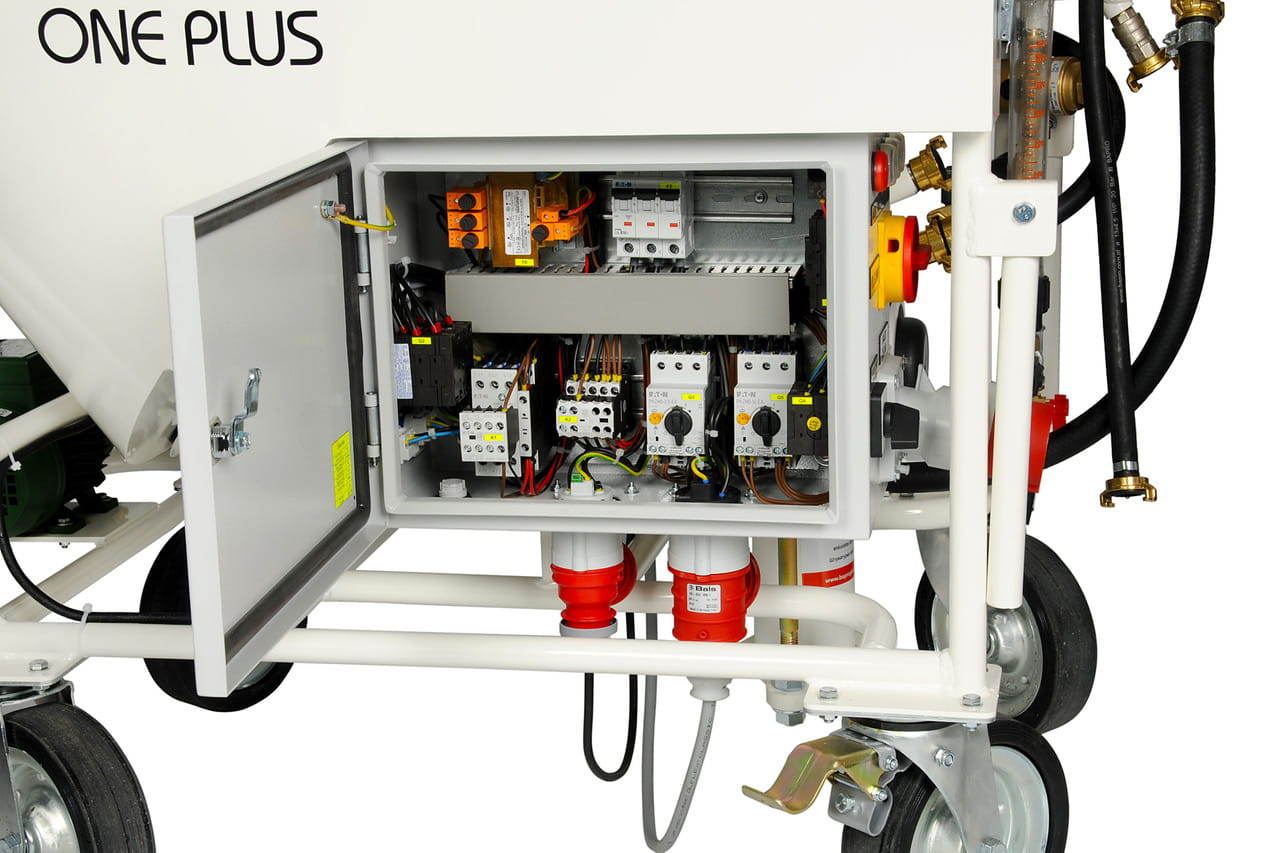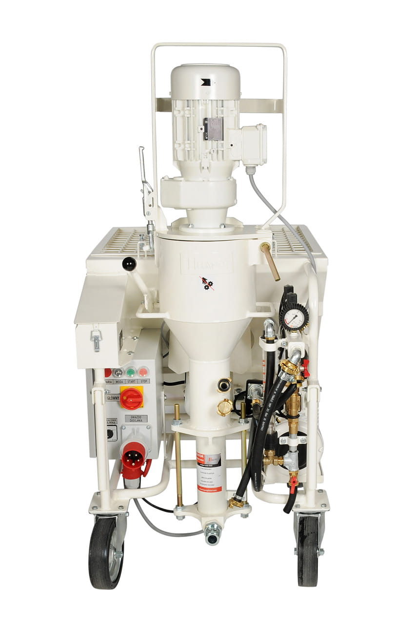Agregat tynkarski BAPRO one MAX 400V to profesjonalna mieszarko-pompa przeznaczona do ciągłej pracy z fabrycznie suchymi mieszankami do maszynowego nakładania tynków. Doskonale sprawdza się przy tynkach gipsowych, wapienno-gipsowych, cementowo-wapiennych, podkładowych, lekkich, modernizacyjnych, płynnych jastrychach, zaprawach klejowych i materiałach ogniotrwałych.